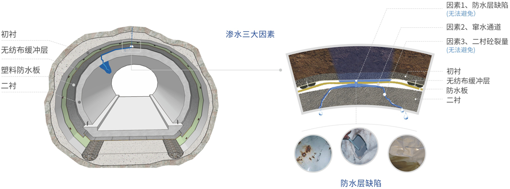 塑料防水板與后續澆筑的二襯混凝土結構不粘結,易竄水,加上難以避免的瑕疵(搭接漏焊、破損等),都會導致防水層與二襯混凝士之間大面積存水,甚至導致防水效果整體喪失。