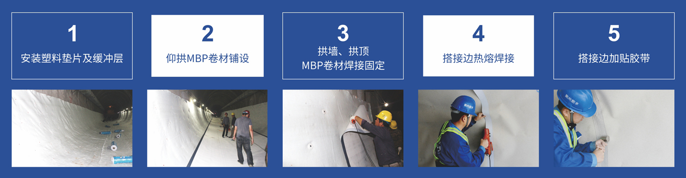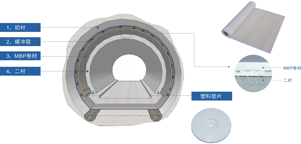 MBP卷材和后澆筑二樹混凝土兩者的牢固粘結,能有效消除竄水,即使防水層出現薄弱點,水也會被鎖死在這一點,不易滲漏,也不會在防水層和二襯混凝土士之間竄流;而結構有裂縫的地方,只要防水層在此部位完好,也不會滲漏。換言之,剛柔兩道構造層相互彌補各自可能存在的缺陷,相得益彰,相互呵護。