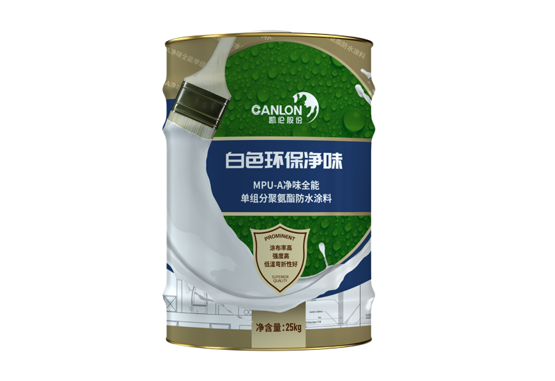 MPU-A凈味全能單組分聚氨酯防水涂料是一種無溶劑、極低揮發性有機化合物、環保型的聚氨酯防水涂料。該產品主要由異氰酸酯和聚醚多元醇構成,配以特殊助劑、填料和顏料,在先進的反應釜式工藝設備中經過聚合反應制成。使用時將其涂覆在防水基層上,與空氣中的濕氣發生反應,在基層表面形成連續、無縫的橡膠特性涂膜防水層。